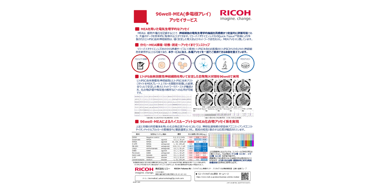 ヒトiPS細胞由来の神経細胞を用いたMEAアッセイは神経科学の分野で有効な解析手法の一つです。リコーは創薬研究へのさらなる貢献を目指して開発を進めてまいります。