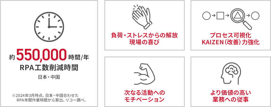 その結果、部門・業務単位でのボトムアップによるプロセスDX活動は確実に定着し、一例としてRPAによる工数削減時間は、年間約550,000時間を実現しています。