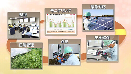 専門オペレーターによる24時間365日の遠隔監視体制や不具合発生時の現地への迅速な駆付け、多様なメーカーの各種設備、機器への対応、また発電量やアラート発生の傾向など稼働状況の見える化を通じて、お客様を支援いたします。