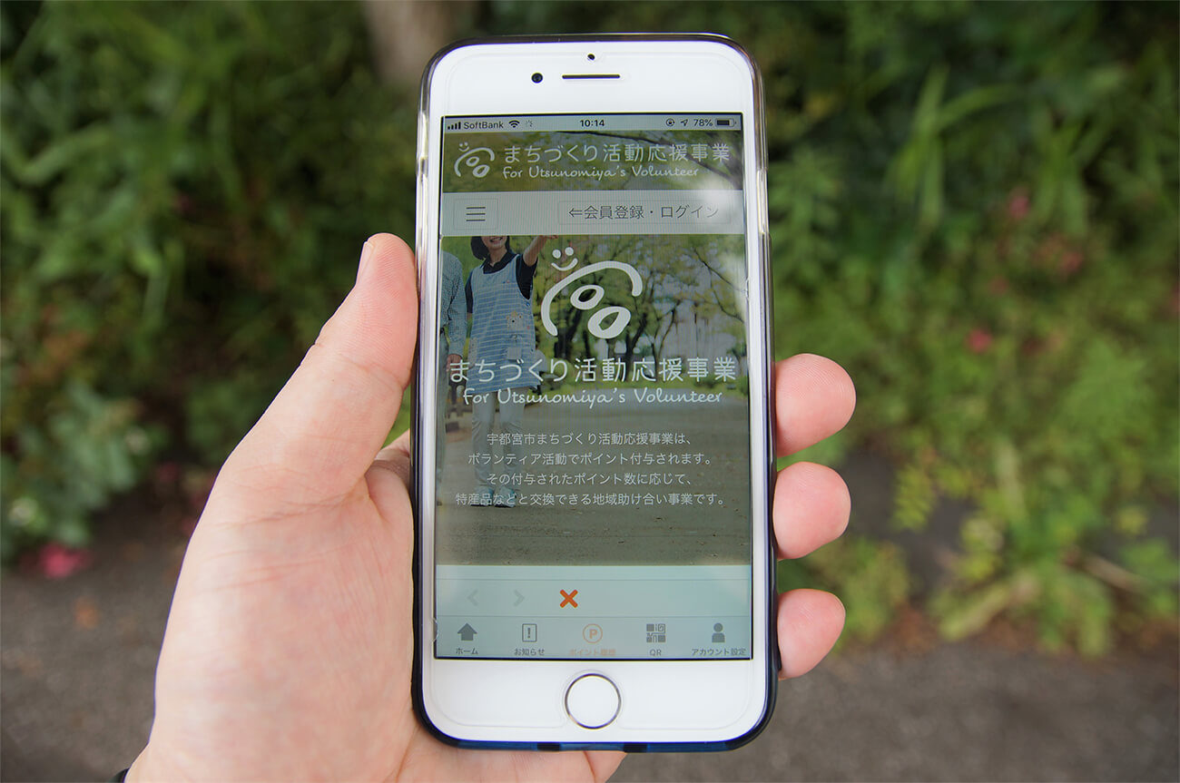 宇都宮市でのボランティア参加をポイント化。貯まったポイントを特産品やバスカードに交換することで、市民の活動を活性化させることを狙ったボランティアポイントシステムの構築および運営業務を受託しました。