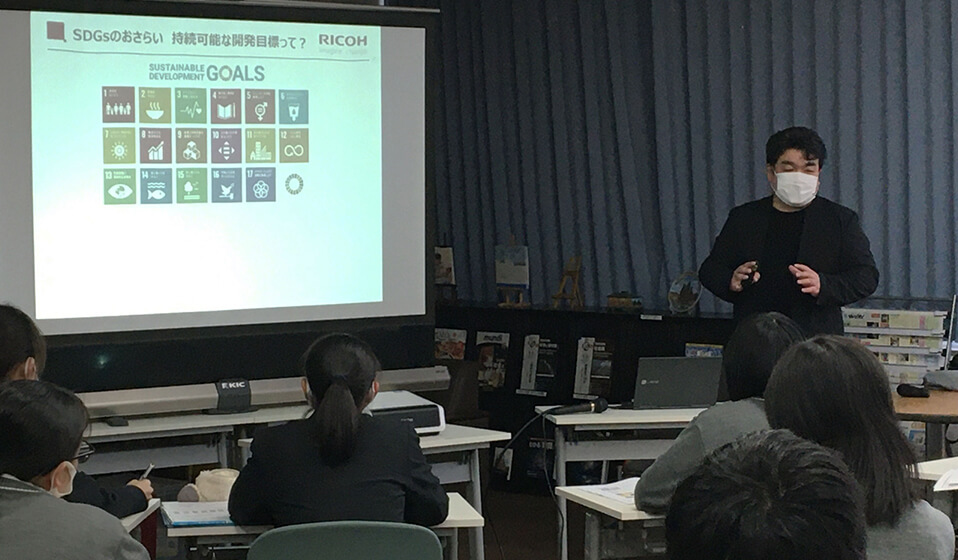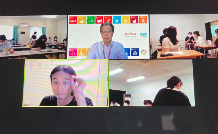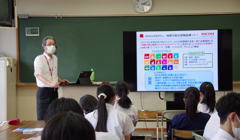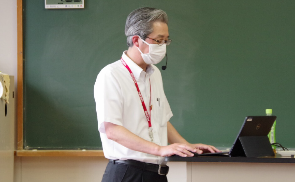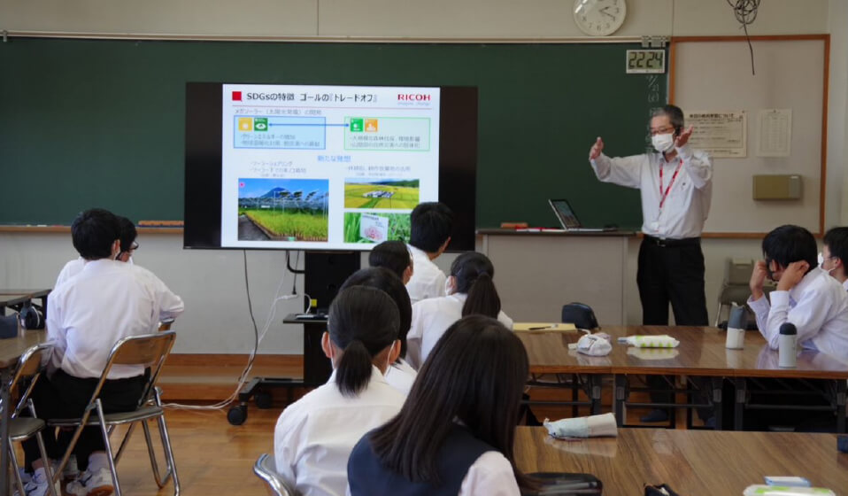 県内の高等学校と大学を対象に、山形大学など地元大学教授の協力を得て、「SDGs(環境分野)」「地球温暖化」「気候変動適応」のうち希望するテーマに応じた環境学習会を開催。リコージャパンは各学校との実施計画調整、教育に使用するICTの配備などを担当しました。