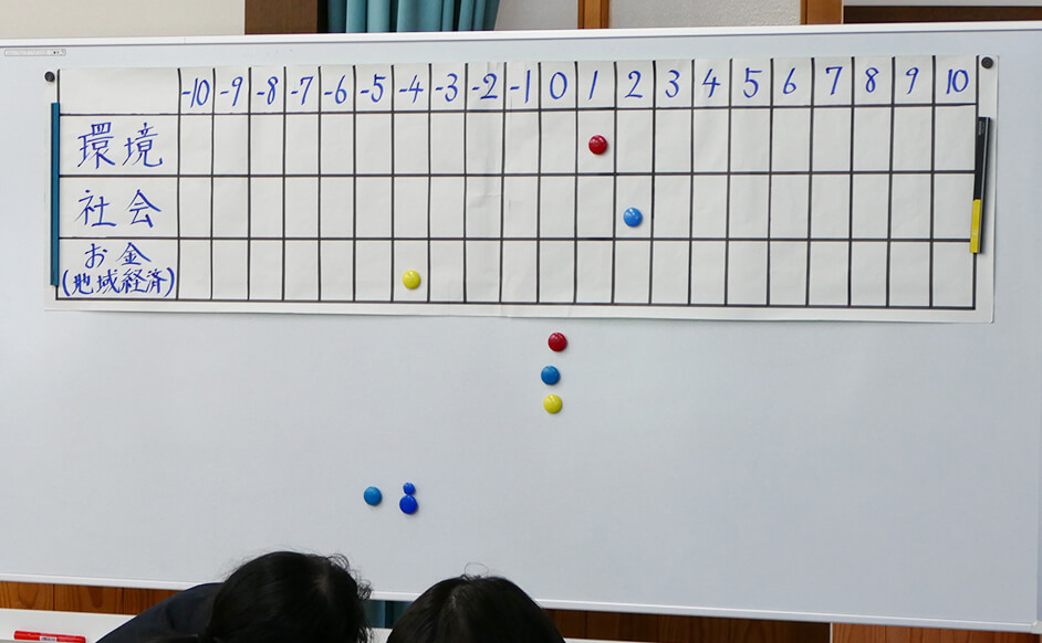 今日は大人数で、しかも時間短縮版で行なったので、生徒たちがどこまで理解できたか不安でしたが、しっかりと山形メーター(地域の環境、社会、経済の進捗)を意識しながら、どの選択が地域を良くするか考えながら取り組んでいました。