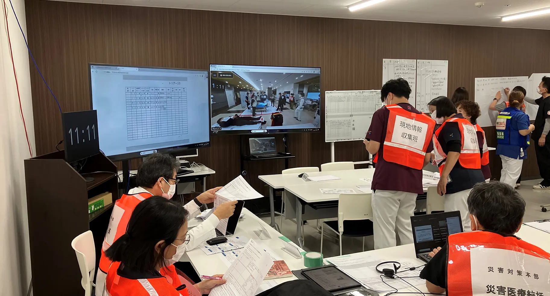 また、3つのエリアで集められた「傷病者の性別」「名前」「年齢」「怪我の状況やどのような処置を行なったか」などの情報は、1階の現地調整所に設置されたeWBに記入。記入された内容は、3階の災害対策本部のeWBとリアルタイムで共有され、病院外への転送が必要かどうかなどの状況判断にもご活用いただきました。
