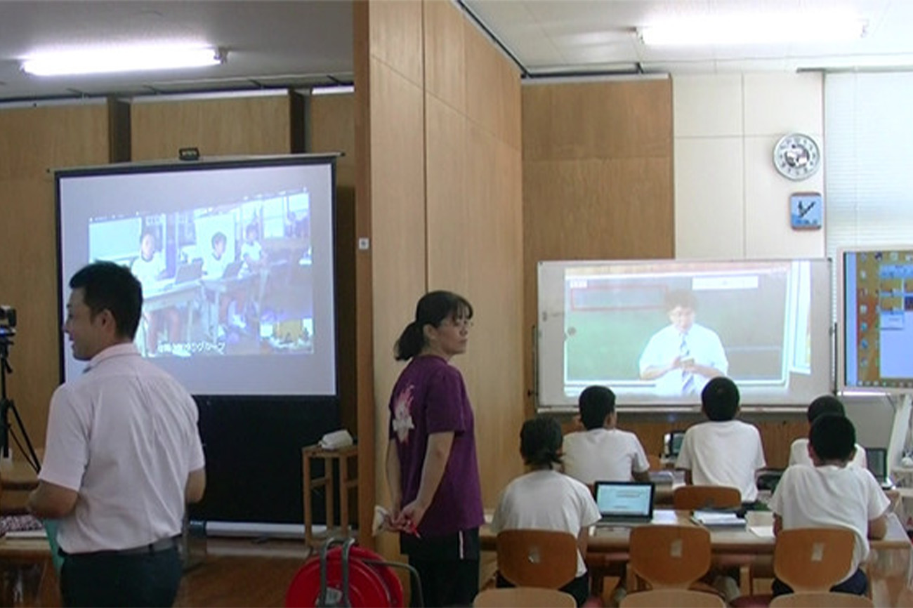 展開している教科は、国語、社会、算数、道徳、外国語活動の5教科です。基本的には2校をつないで行いますが、外国語活動では、3校をつないだ授業も展開しています。ALT(外国語指導助手)の先生が、各学校に来るのは、1ヵ月に1度だけですので、3校をつなぐことで、児童がネイティブな英語に触れる機会を増やすことが可能になります。先日は、大きなスクリーンに3校の様子を映し出し、ジェスチャーで動物の名前を当てるクイズや、ALT(外国語指導助手)の先生から発音を学ぶ授業を展開しました。」