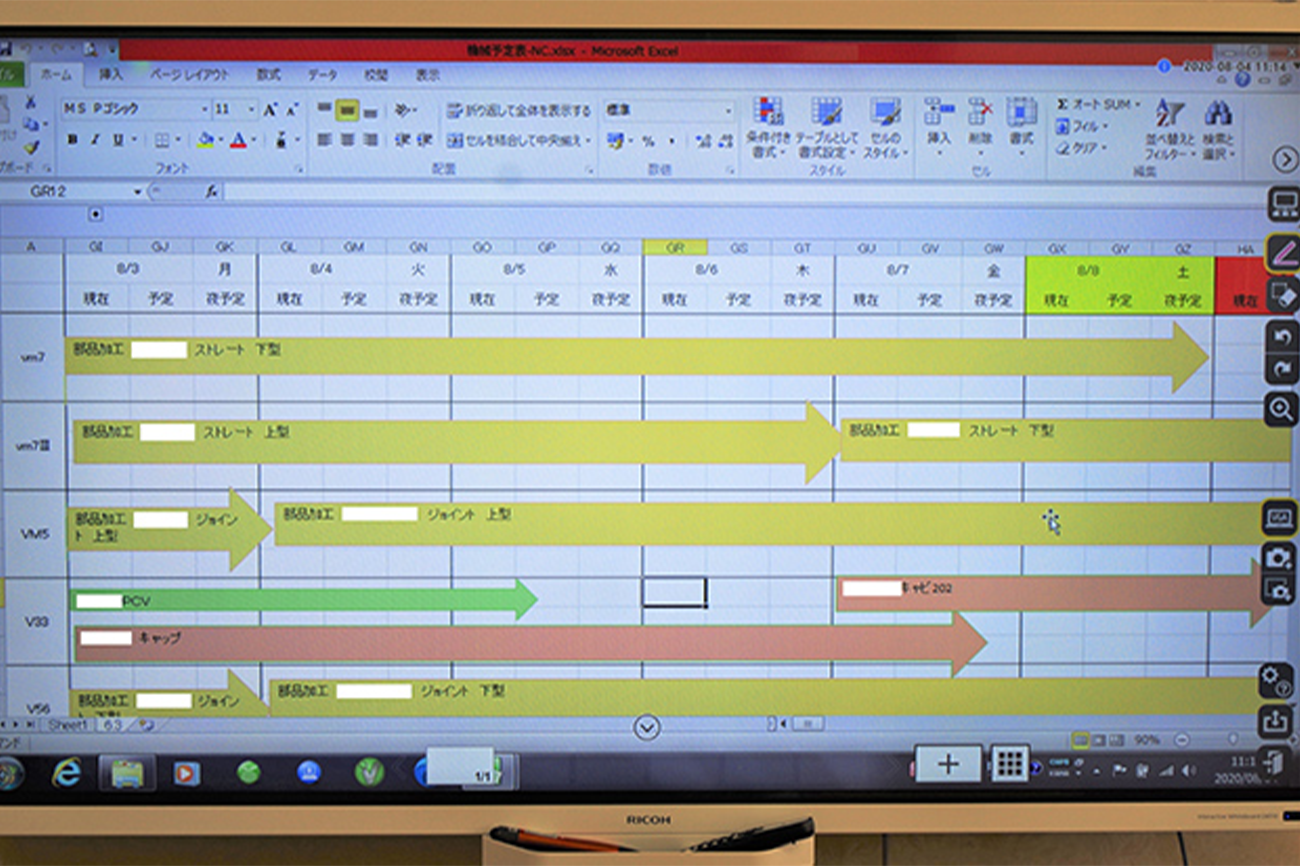 「金型は一面一面納期が異なり、納期の前倒しも多々あります。当社では、進捗を正確に把握し急な納期変更にもフレキシブルに対応していくため、製品単位の工程表のほか、機器の稼働状況を確認する工程表等も作成し管理しています。