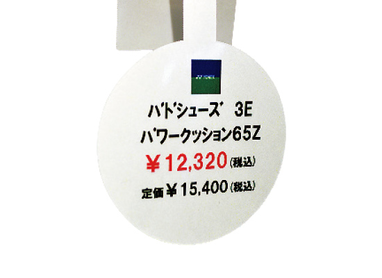 シューズの横のスイングPOPはラミネート不要の用紙『ラミフリー』で作製されている。