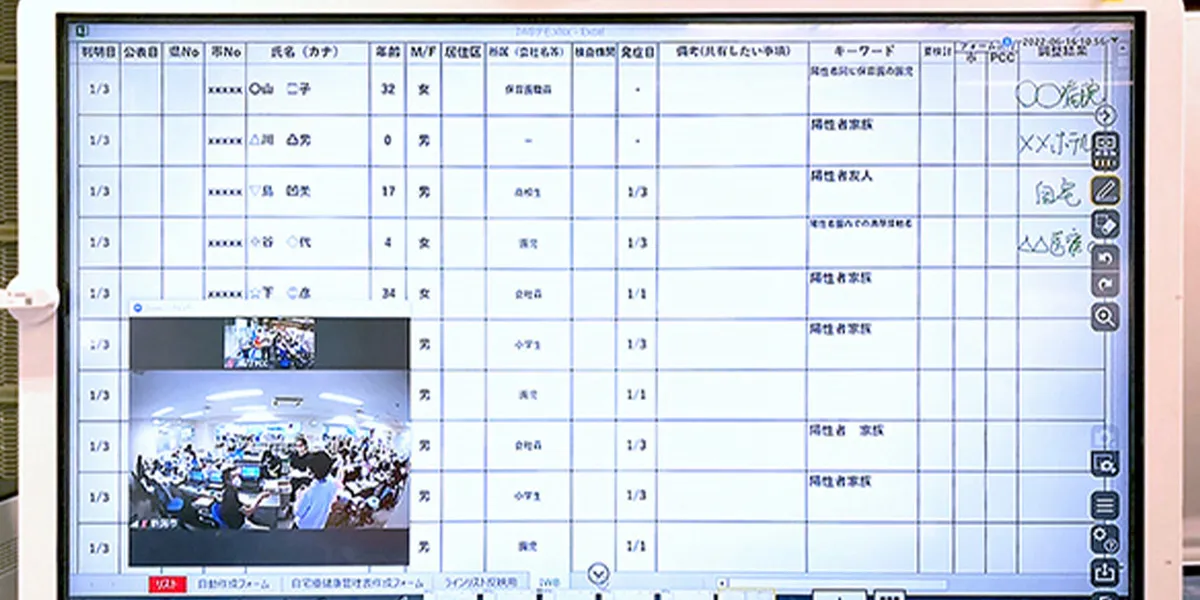 石川様「病棟と内視鏡室にRICOH IWBを置いて患者さんの治療リストを表示し、双方から情報更新をしています。病棟の看護師が患者さんの前処置状況を、赤(前処置未完了)→黄色→青(前処置完了、内視鏡室へご案内)の順に色分けして更新し、内視鏡室では、検査・治療の予定終了時刻を適宜更新。RICOH IWBに書き込んだら、右上に更新時間を書き込むオペレーションにしています。