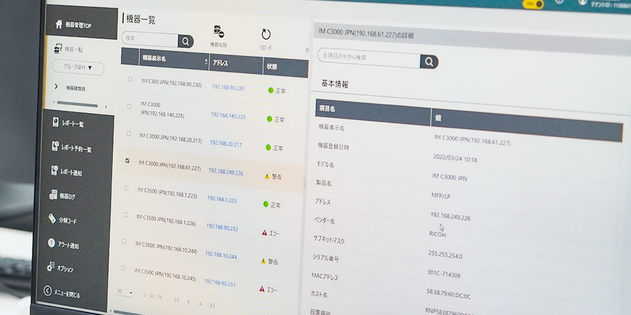 Cloudのレポート機能に機材の一覧表示があり、機材のシリアルナンバーも含めてすべてのデータをまとめて取れるため、台帳と突き合せるだけで管理ができます。便利に使っている機能の1つです」(上吹越様)