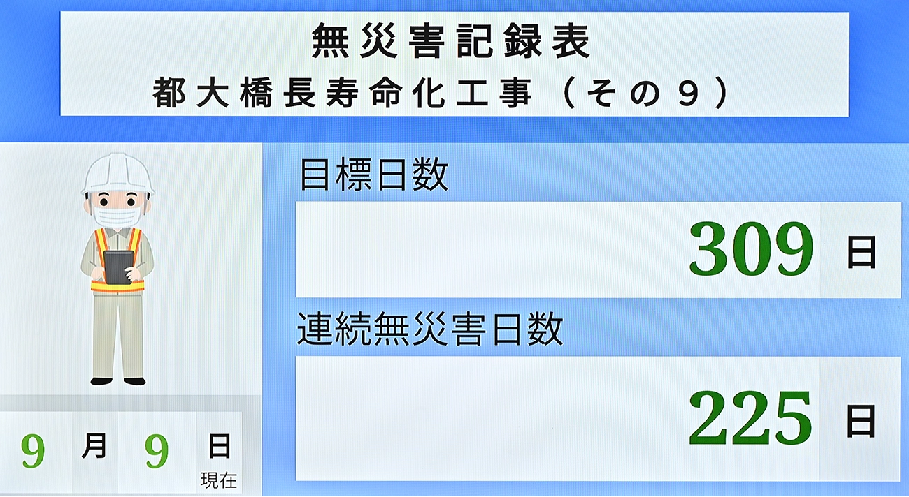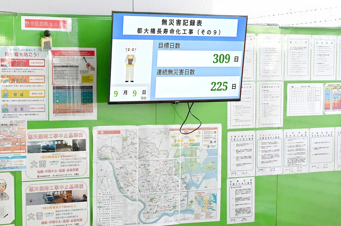 さらに、工事現場用としても1台導入し、現在は橋梁塗装工事の現場で活用しています。この現場では、熱中症予防情報コンテンツや無災害記録表など、安全意識向上につながるコンテンツを中心に配信しています。