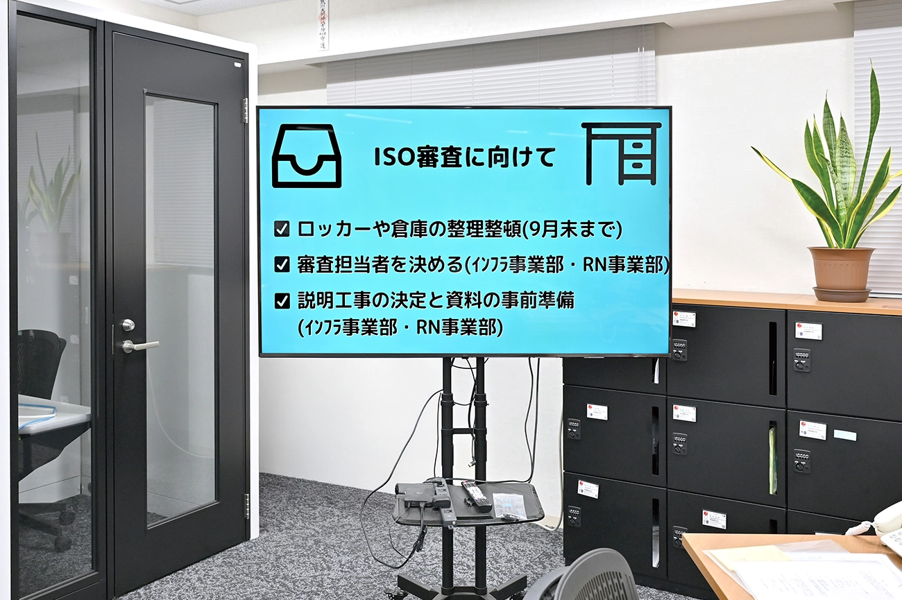 従業員が仕事の合間に手軽に見ることができるように、執務エリアにディスプレイを設置。