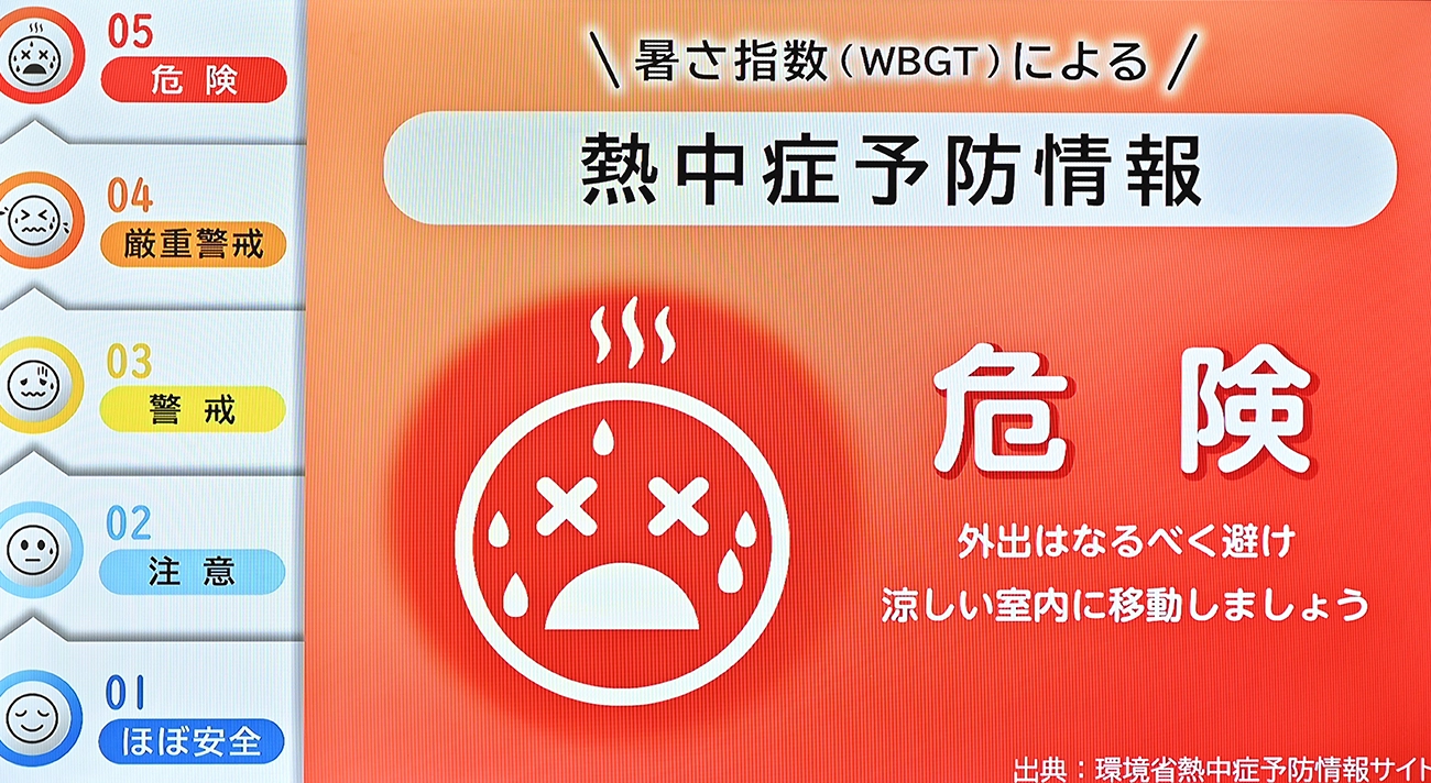 色とイラストで熱中症の危険度を表したコンテンツは、少し離れた場所からでも認識しやすい。