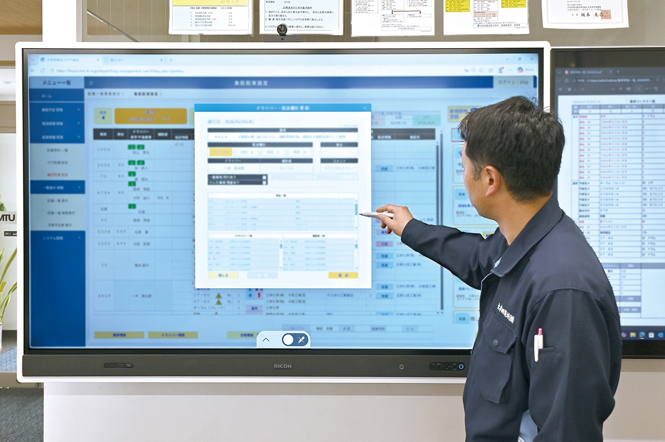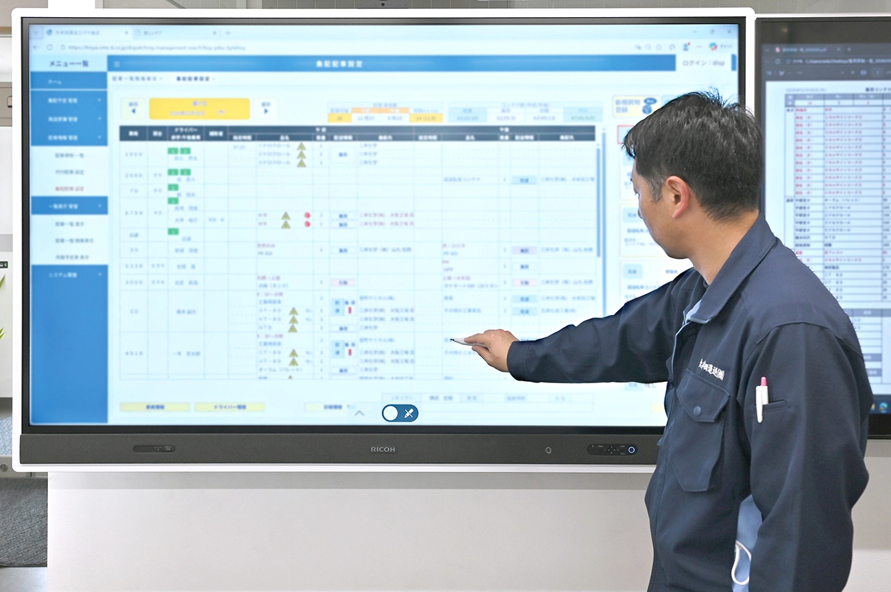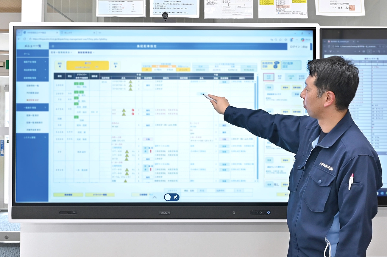 大道様「配車システムの画面を、従来のモニターに変えてRICOH Collaboration Boardに表示することで、管理者だけでなくドライバーも、画面上からタッチ操作で各種情報を引き出せるようにしています。