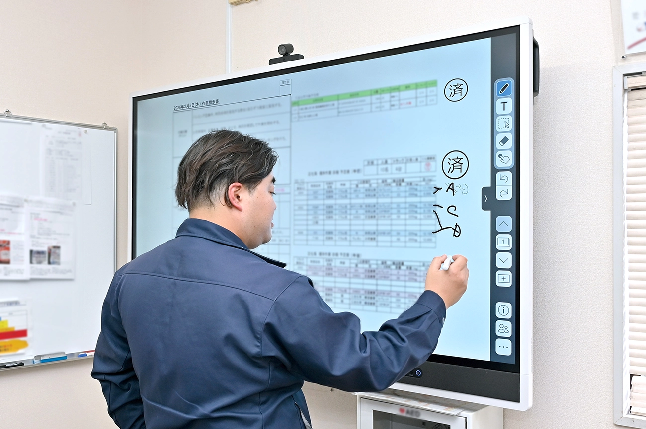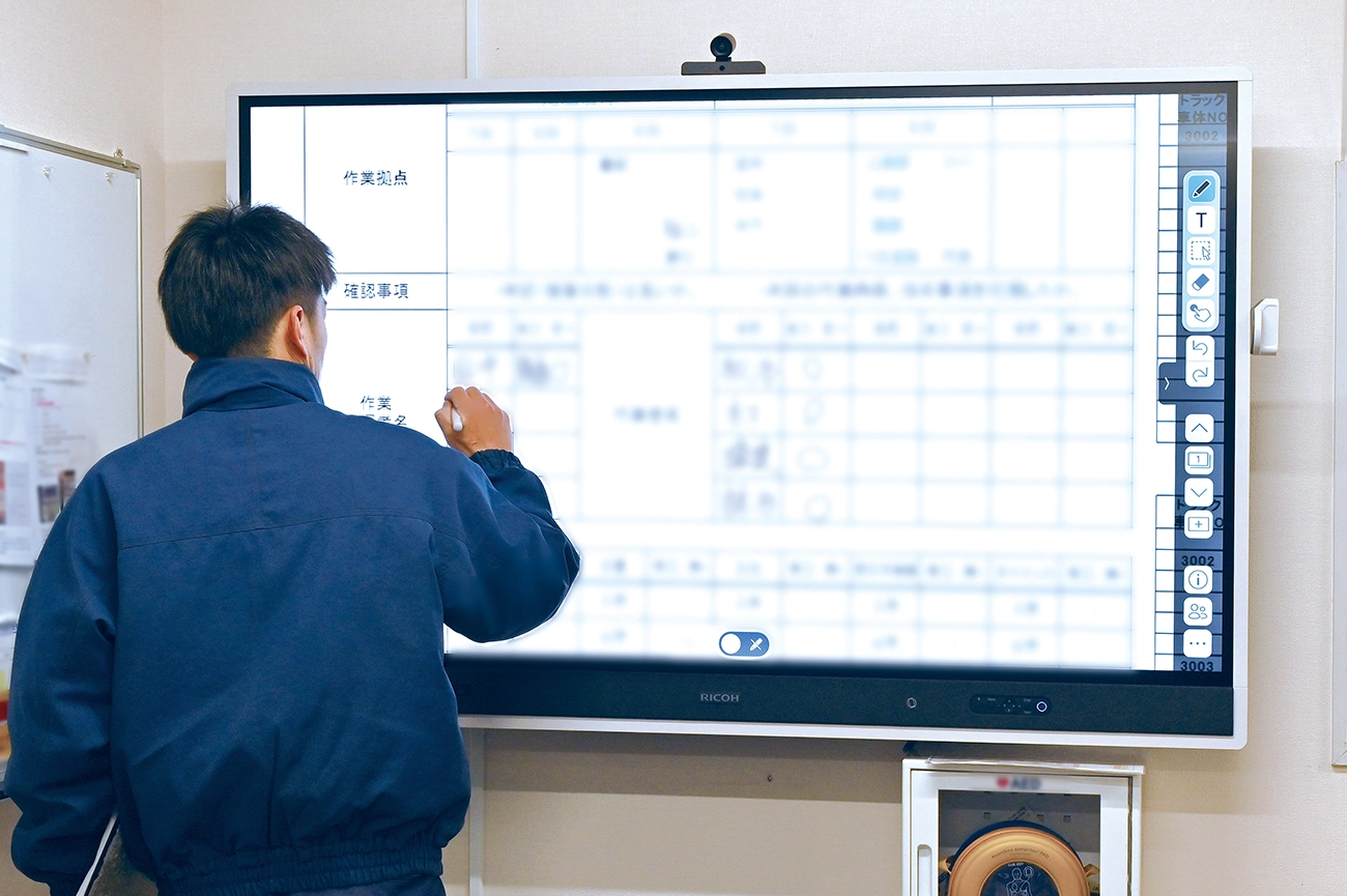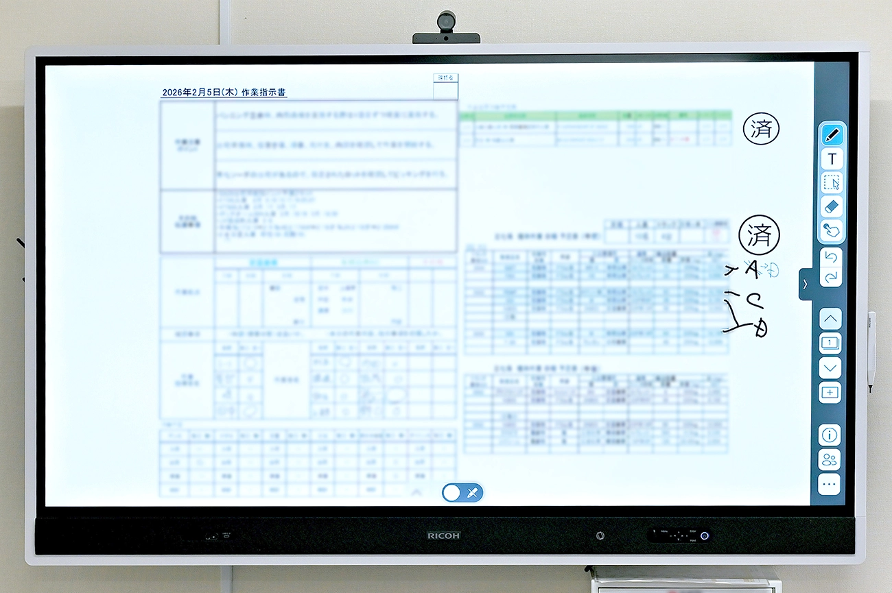 従来は、紙で運用していた作業指示書を、RICOH Collaboration Board Cloudにアップし、RICOH Collaboration Boardで共有する仕組みに変更しました。その結果、それぞれの拠点から作業指示書を確認できるようになり、手書きのサインも画面上で完了できるため、従来の朝礼のように1拠点に集まる必要はなく、移動時間のロスが軽減されています。手書きでサインした画面はそのまま保存できるので、保管資料のペーパーレス化も実現できました。」