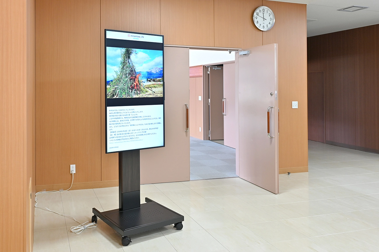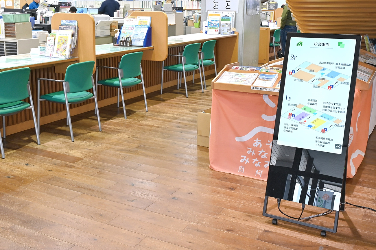 村役場、道の駅、複合施設に計7台を導入。行政手続きの案内から観光情報、Instagramの最新コンテンツまで、様々な情報を村役場から遠隔配信。キャスター付きのスタンドを採用することで、用途に合わせた移動もしやすく、選挙やイベントの案内板としても活用されています。