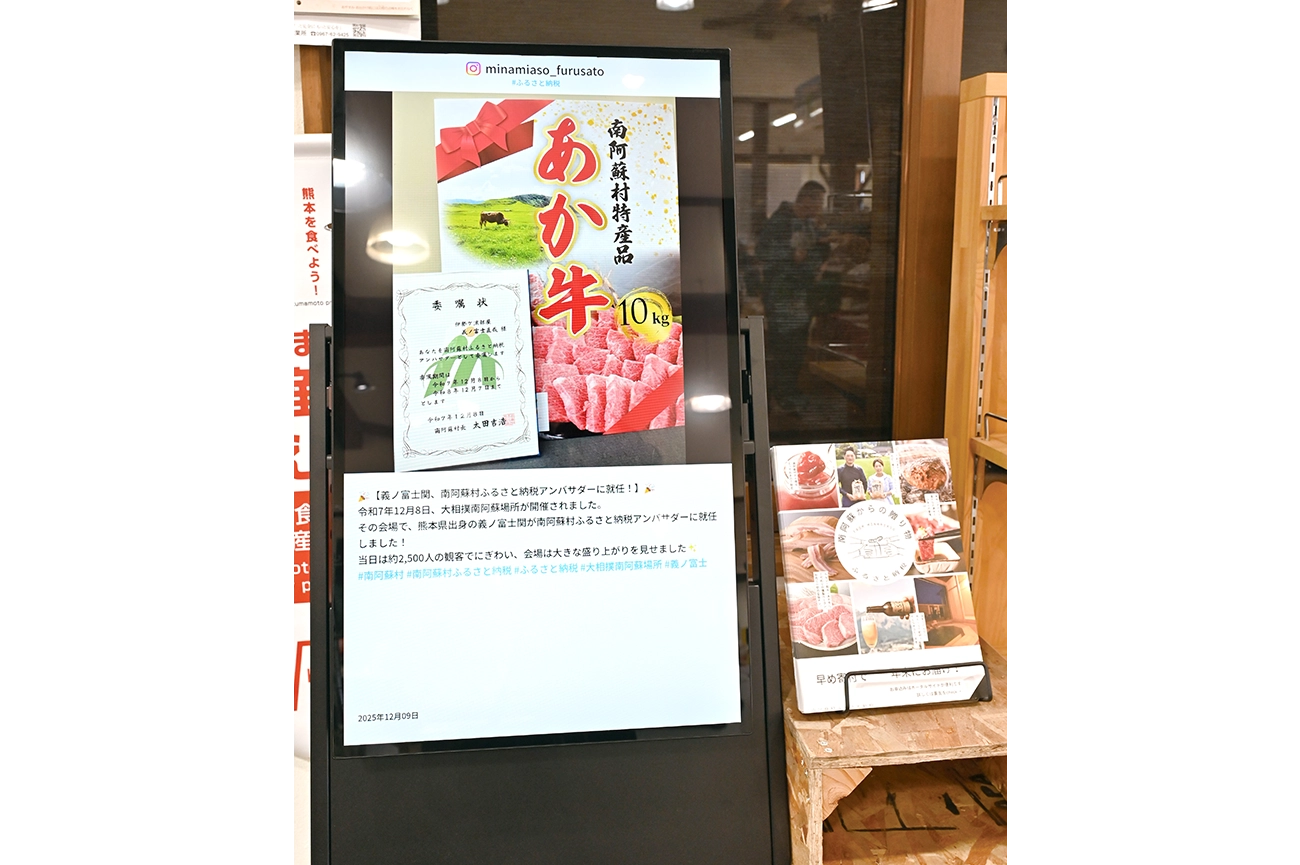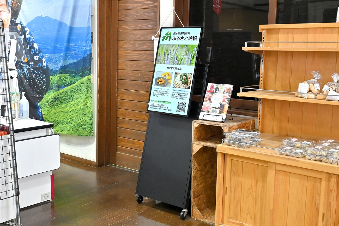 道の駅「あそ望の郷くぎの」には、地域内外から多くの方が訪れます。お買い物やレジャーに訪れる皆様に、南阿蘇村の魅力をもっと知ってもらうため、道の駅でもリコーデジタルサイネージを活用したいと思いました。