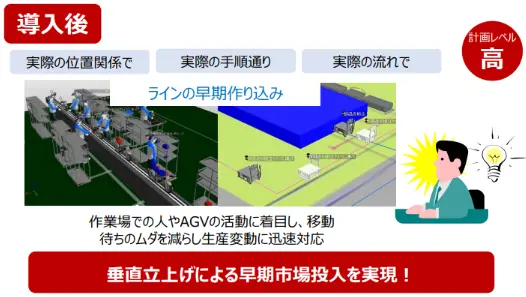 レイアウトや作業手順、製品データなどの情報をマージして、より良い工程設計、レイアウト設計など最適な生産管理を実現します。例えば現場での人やAGVの動きを可視化、移動待ちのムダをなくすことができます。
