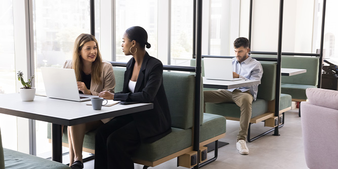 近年はオンラインでのミーティングが当たり前になりましたが、オフィス内でも社内外のメンバーとのWeb会議システムを用いたミーティングが数多く実施されています。ハイブリッドワークといった新しい働き方には欠かせないオフィスに備わる機能として、Web会議対応のミーティングスペースを用意する、ソファとパーティションによる気軽なミーティングスペースを用意するのも一案です。