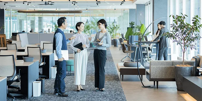 そして組織内の人々が有機的につながり合えるコミュニケーションが自然と活性化する環境も欠かせません。執務エリアに設けられたちょっとしたミーティングスペースなどの設置が挙げられます。