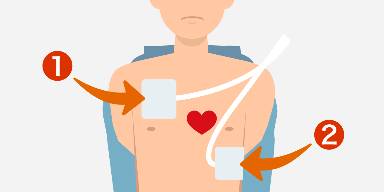 音声ガイドが流れ、電極パッド装着指示ランプが点滅します。