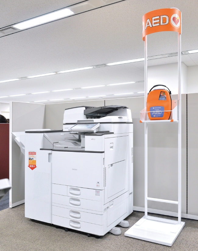 AEDは2004年から一般市民でも取り扱いが可能になりました。公共機関をはじめ、店舗や一般企業でのAED設置が急速に進んでおり、リコージャパンもAEDの普及に努めています。