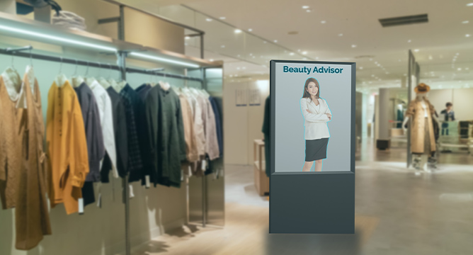 ショーウインドウなどにディスプレイを設置し、コンテンツを配信して通行人へアプローチをします。例えば、「新作商品」や「ブランドイメージ」を配信することで、店舗内への誘導や店舗認知向上の役割を果たします。