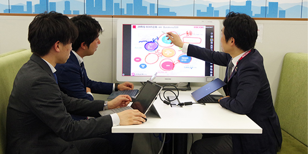 リコー インタラクティブ ホワイトボード(RICOH IWB)とデジタルサイネージを中心にICTツールを効果的に組み合わせることで、新しいミーティングスタイルとコミュニケーション活性化を実現。