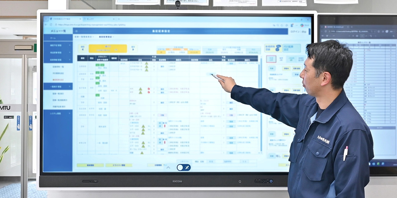 通運会社のDXをRICOH Collaboration Boardで促進。配送状況や倉庫の作業進捗を見える化して共有。業務効率化・移動時間のロス軽減・ペーパーレス化の実現へ。