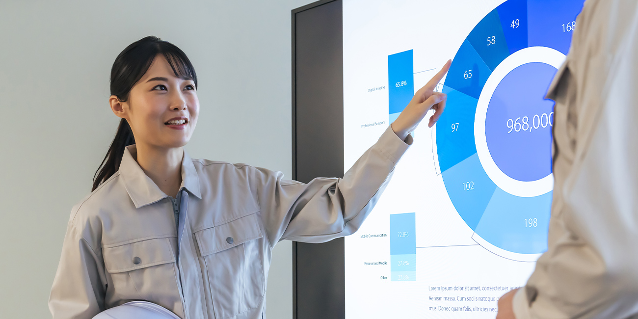 工場にディスプレイを設置して、情報を見える化することで管理者同士のデータ共有が可能になります。ディスプレイを使うメリットは数多くあるため、次の項目でご紹介します。