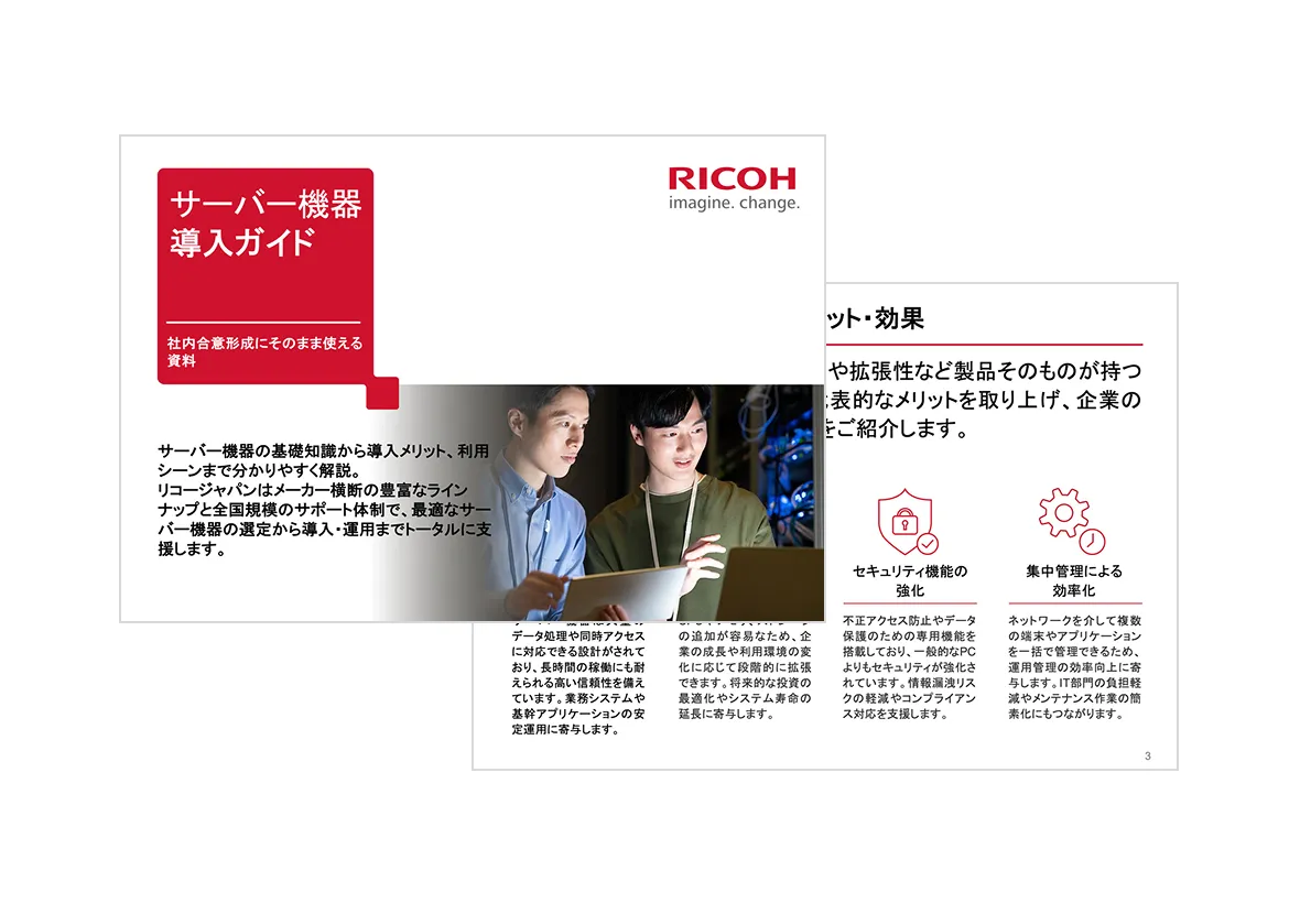 リコージャパンは、国内外の主要メーカー製品を幅広く取り扱うマルチベンダーとして、お客様の業務やシステム構成に最適なサーバー機器の選定・導入をサポートします。豊富なラインナップの中から用途や規模に合わせた最適な構成をご提案し、キッティング(初期設定)や設置、ネットワーク接続、セキュリティ設定までワンストップで対応します。また、全国に展開する営業・技術サポート網を活かし、導入後の保守・運用支援やトラブル対応まで安心のサポート体制を整備。企業規模や業種を問わず、長期的なIT基盤の安定稼働を支援します。