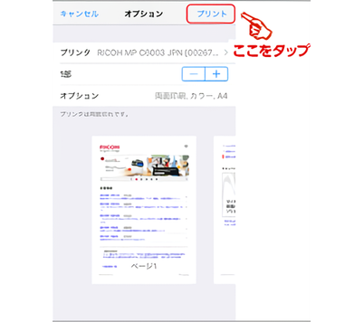 iPad/iPhoneなどのiOSに標準に搭載されているプリント機能です。同一ネットワーク上の複合機やプリンターを自動検索し、印刷することができます。部数、片面/両面、印刷ページ数指定(iOS9以降)の設定が可能です。