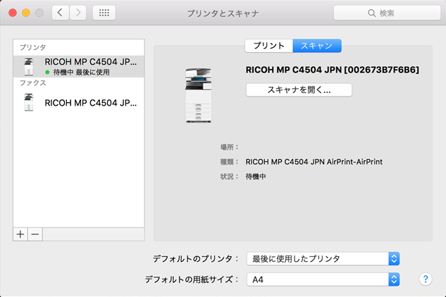 接続設定が完了している機器にて[スキャン]をクリックします。