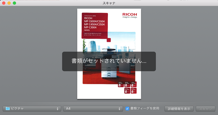 [書類がセットされていません]が表示されたら、スキャン完了です。