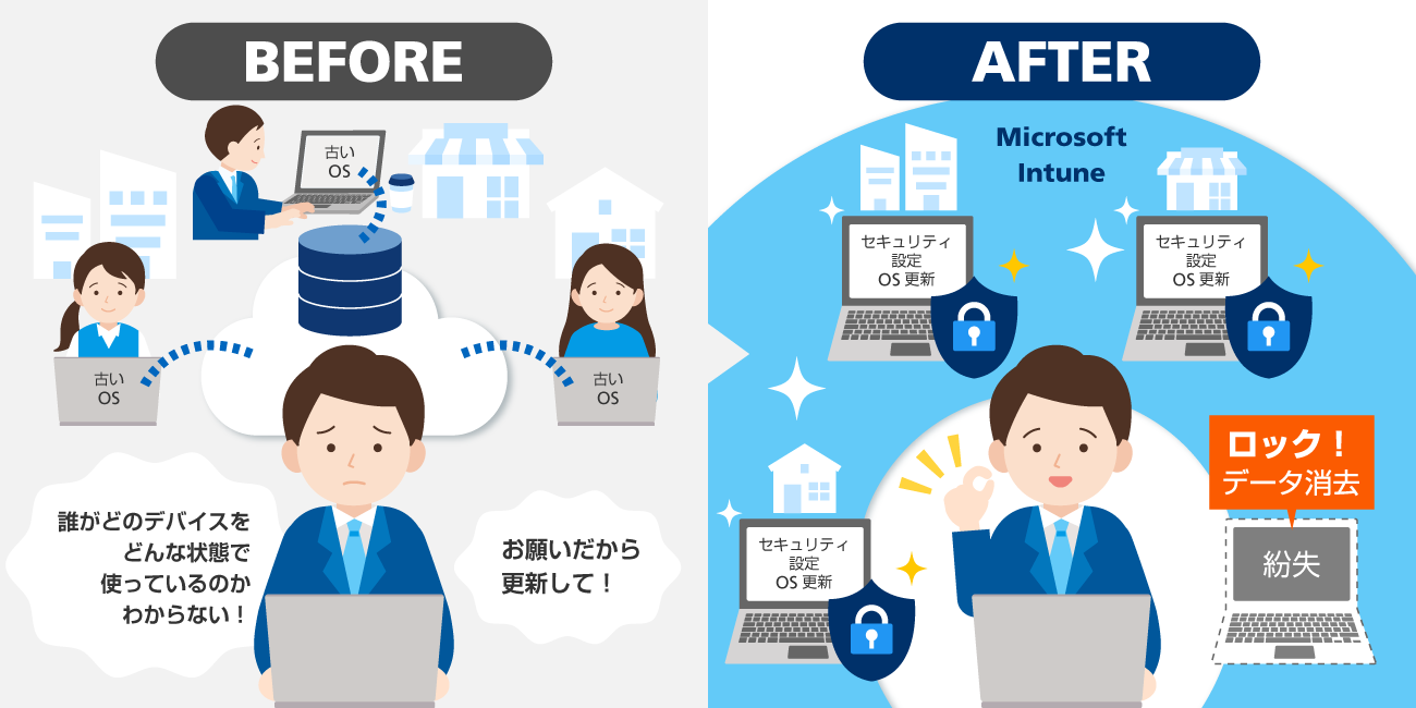 拠点や働く場所が増えるほど、データの管理やデバイスごとの設定、OSやアプリケーションの更新、私物デバイス(BYOD)の制限など、見えないリスクが積み上がっていき、結果として、紛失・盗難時の情報漏えい、不審ログイン、不正なアプリケーションのインストールといった問題が発生する可能性も高くなっていきます。