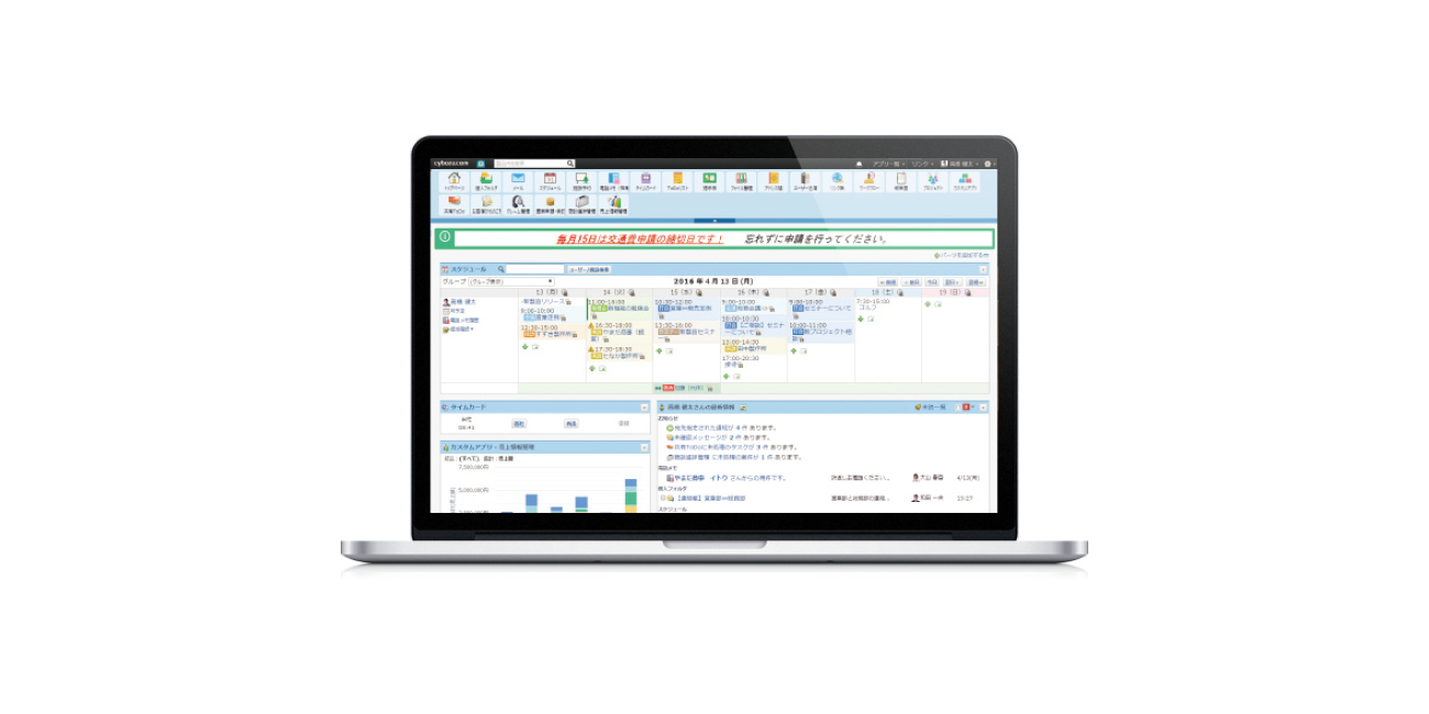 スケジュール共有や会議室などを押さえる設備予約、掲示板やファイル共有、ワークフローといった豊富な機能を標準で備えています。