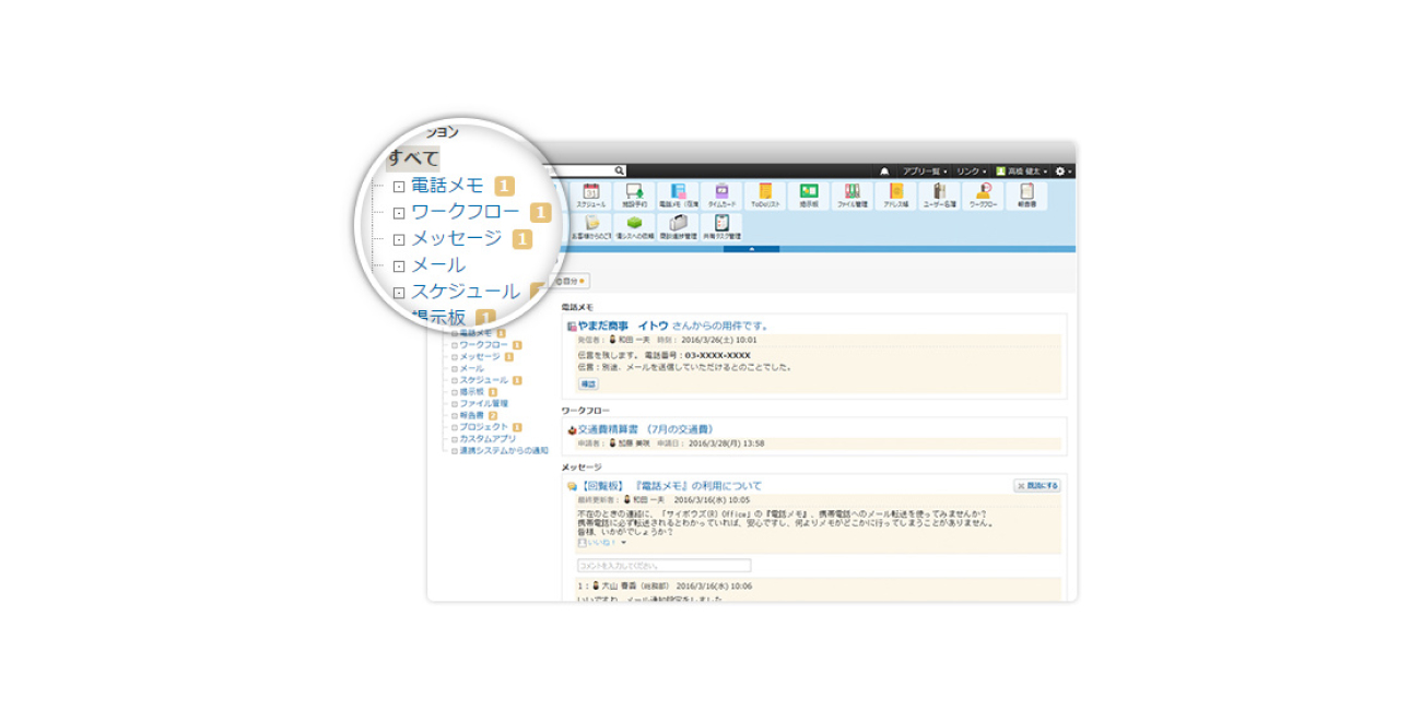 これまで、一般的な電子メールや電話、FAXなどで行っていた業務をグループウェアに集約することで、業務効率が改善され、チーム力が高まります。
