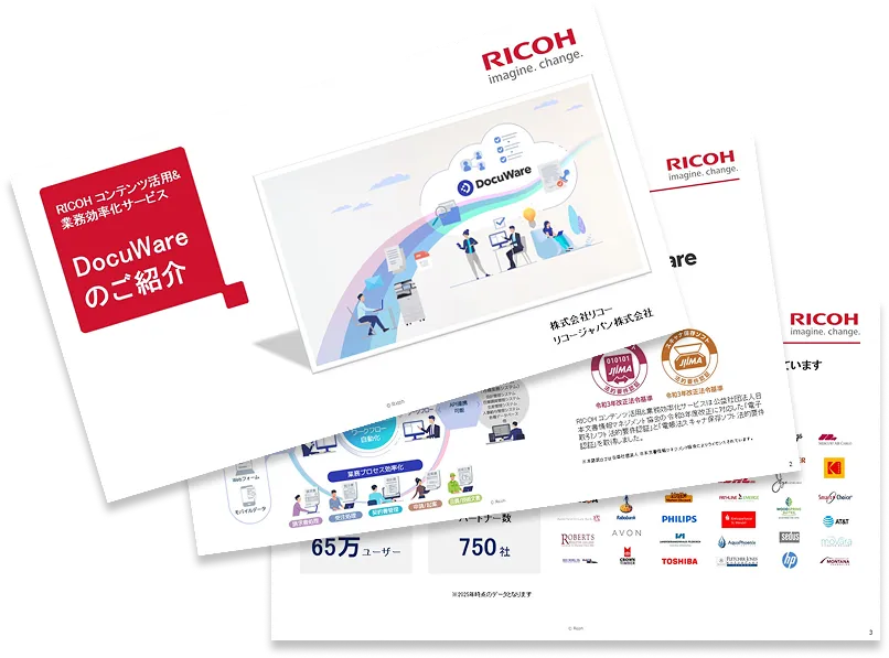 そんな障壁を軽々と乗り越えて、コンテンツの一元管理・ワークフローの自動化や、外部システムとのスムーズな連携により、大幅な業務改善を実現するのが、リコーのクラウドアプリケーションDocuWare(ドキュウェア)による「RICOH