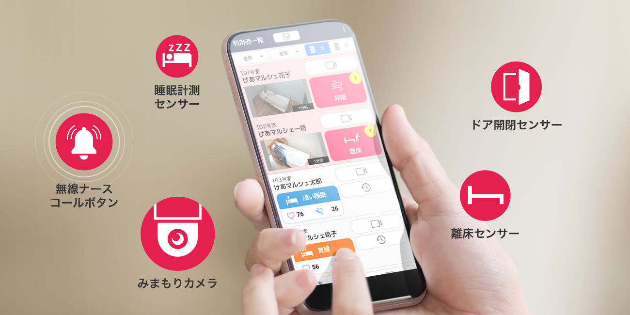 さまざまなナースコールシステムや介護記録システムとの併用も可能。事業者にとって導入しやすいシステムを目指しました。