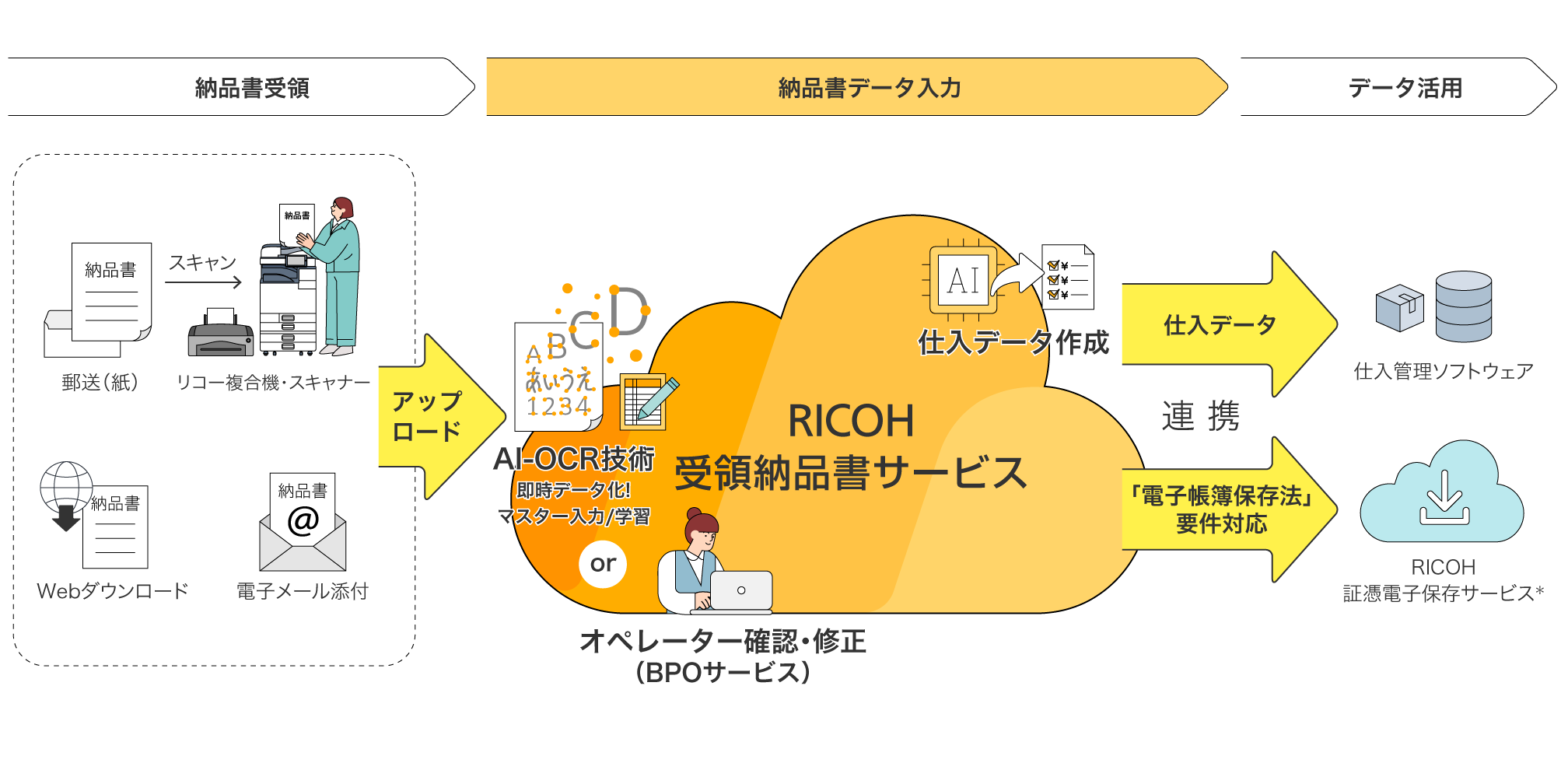 毎日届く納品書のデータ入力に、ご苦労はありませんか?「RICOH 受領納品書サービス」なら、納品書をクラウドにアップロードするだけです!AI-OCRにより、明細行まで即時に正確に文字データ化します。またAIがマスター情報を学習し、入力の負担軽減と合わせ業務の属人化も解消できます。仕入情報のスピーディーな活用により販売機会の拡大を可能にし、電子帳簿保存法やインボイス制度にもスムーズに対応。受領納品書に伴う業務をトータルにご支援します。