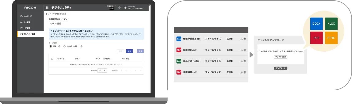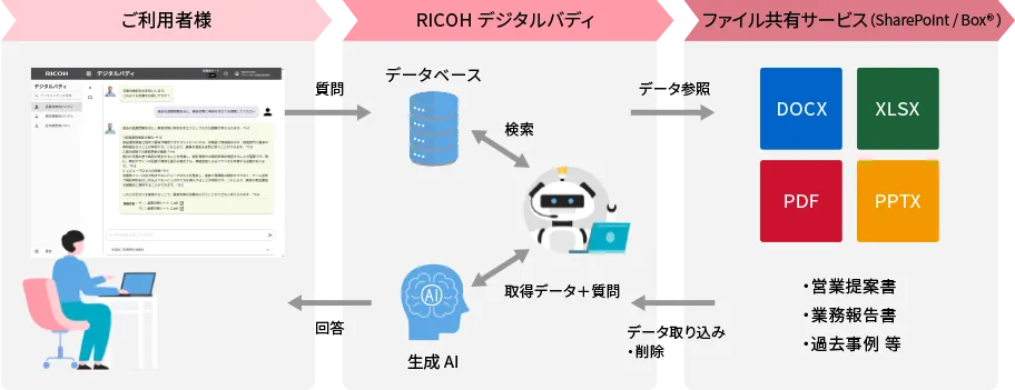ファイル共有サービス上のファイルと生成AIの直接データ連携が可能。社内に蓄積した情報資産をRICOH デジタルバディでそのまま活用でき、利便性が圧倒的に向上!