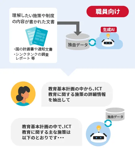 庁内規定について知りたいとき、施策や制度の通知文書を探したいとき、過去の報告書を参考にしたいとき、チャットで質問をすると庁内データを基に回答を自動生成します。