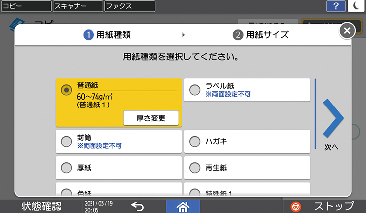 コピー時に手差しトレイへ用紙をセットすると、自動検知したサイズを表示。画面の指示に従って設定変更も簡単にでき、サイズ違いによる紙詰まりを防止します。