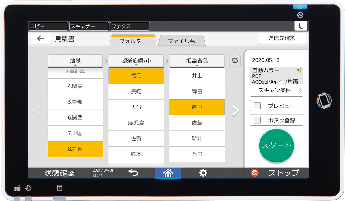 スキャンした文書の保存先やファイル名などを簡単に画面から設定できます。業務ごとの設定の登録やプレビュー確認も可能です。