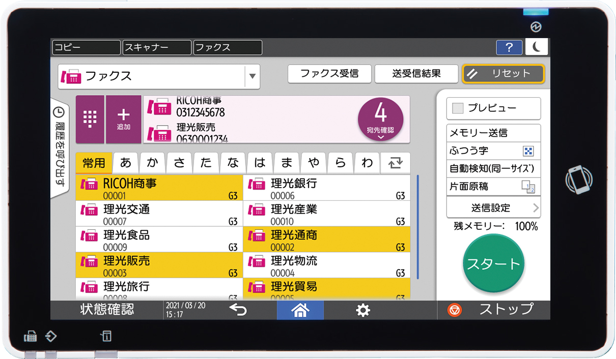 ファクス番号は、テンキーで直接入力できます。また、登録された宛先の選択や、各種送信設定も見やすく大きなアイコンで表示され、どなたも簡単にファクスをご利用いただけます。