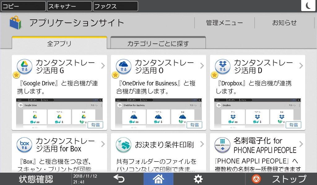 複合機の操作パネル(MultiLink-Panel)からアクセスすることで、お客様の業務や用途に応じたアプリケーションを選んで、簡単・手軽にお使いの複合機にインストールできる、専用のダウンロードサイトです。スマートデバイスのような直感的な操作で、お使いの機器のパワーアップやカスタマイズを行ない、快適な働き方の実現をサポートします。