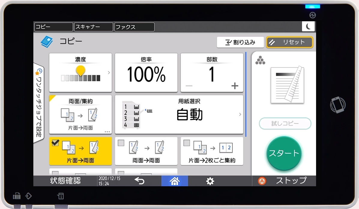 手差しトレイに用紙サイズ検知機能を搭載。コピー時に手差しトレイへ用紙をセットすると、自動検知したサイズを表示。ウィザードで簡単に設定変更もでき、サイズ違いによる紙詰まりを防止します。
