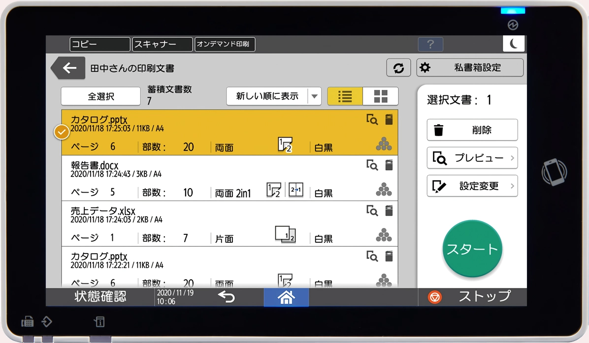 受信したファクス文書は、印刷の有無を操作画面上で簡単に切り替えられます。例えば、不在時に印刷禁止に設定すれば、セキュリティー対策にもなります。