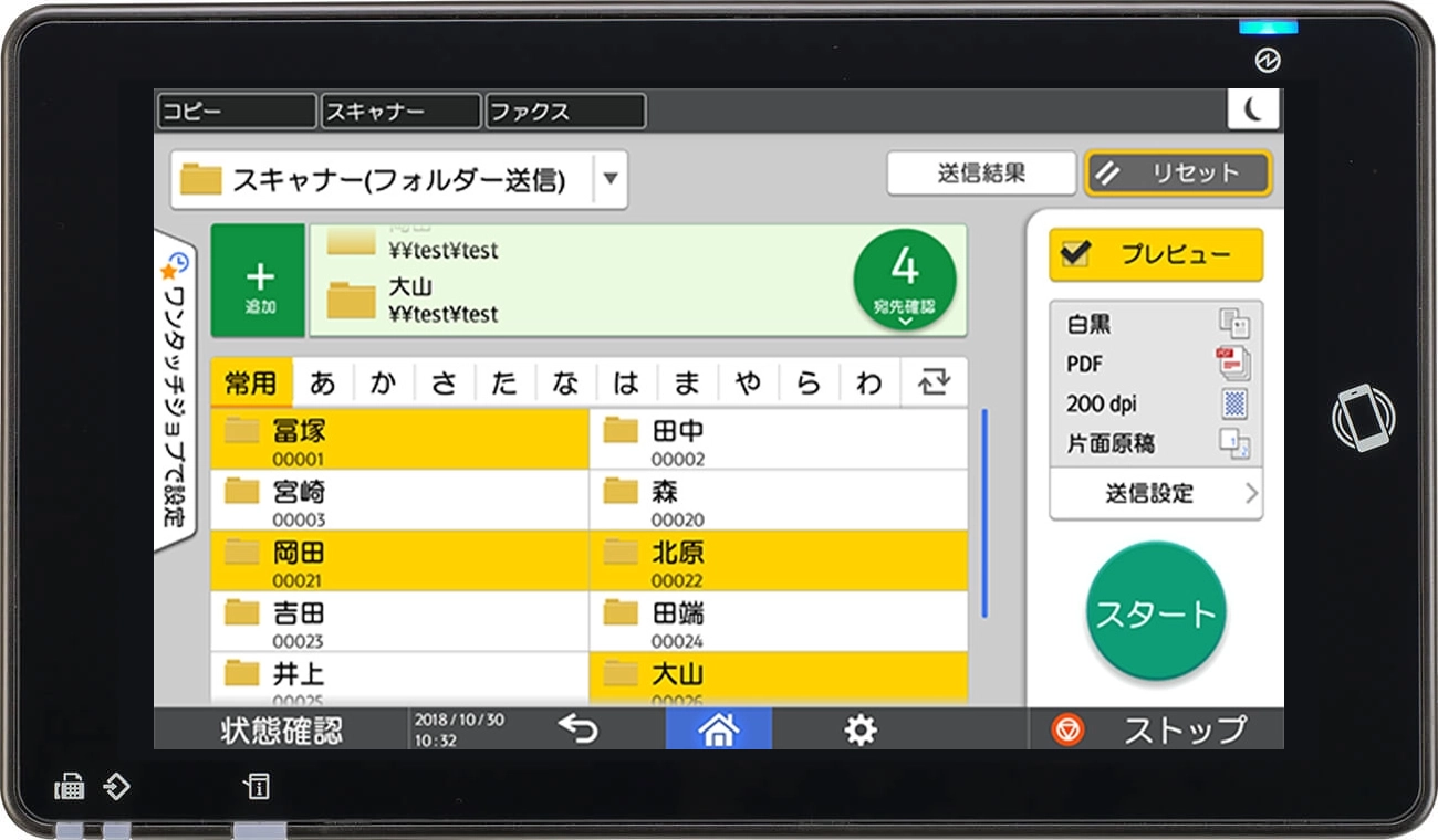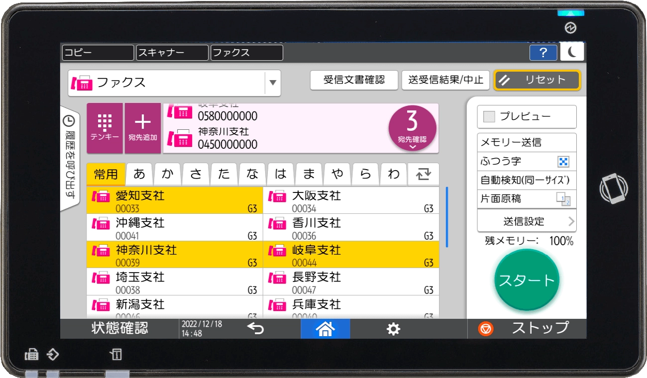 ファクス番号は、テンキーで直接入力できます。また、登録された宛先の選択や、各種送信設定も見やすく大きなアイコンで表示され、どなたも簡単にファクスをご利用いただけます。