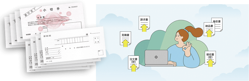 改正電子帳簿保存法に準拠した証憑電子保存サービスとスムーズに連携。スキャンした電子データを直接クラウドにアップロードし、検索項目を入力するだけで電子保存が完了します。
