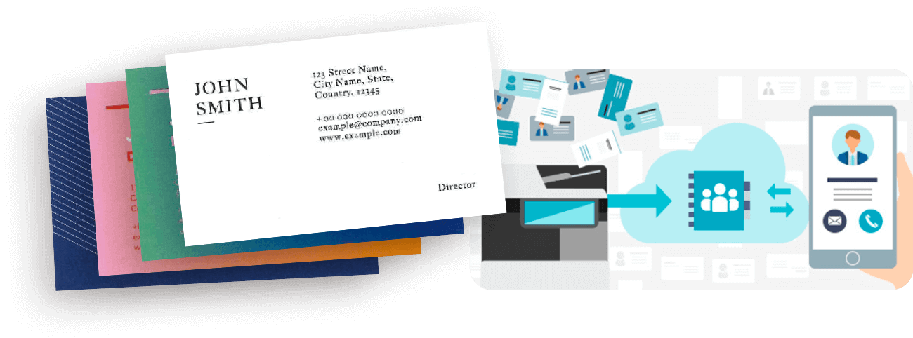 複合機に名刺を置いてまとめてスキャンするだけで、効率的に名刺情報のデータベース化が行なえます。クラウドにアップロードすることで外出先やリモート環境からもアクセス可能。社員一人ひとりの名刺情報を会社の共有資産として活用できます。