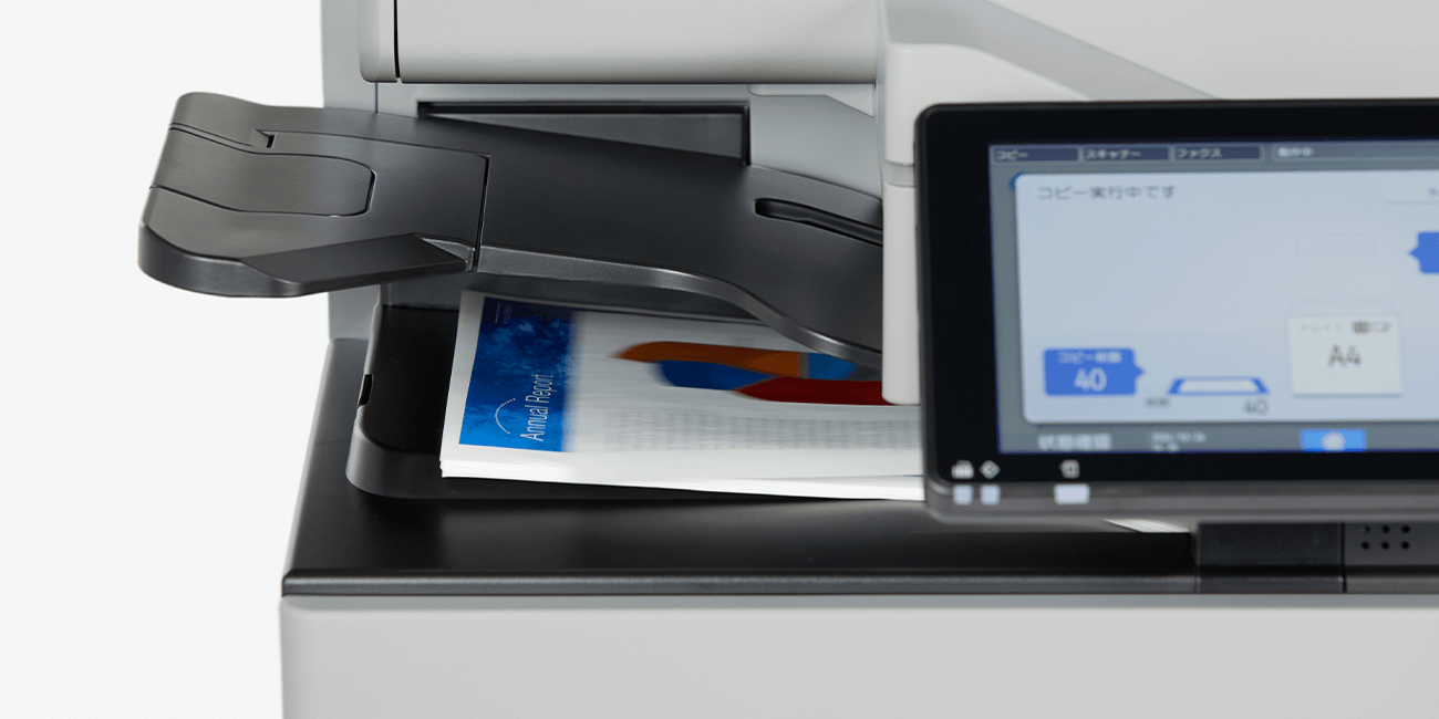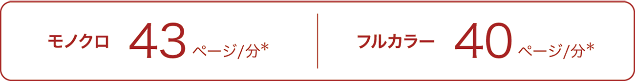 コピー/プリント速度は、片面両面同速のモノクロ43ページ/分*・フルカラー40ページ/分*を実現しました。A3カラー複合機同等の性能で快適にオフィスドキュメントを出力できます。